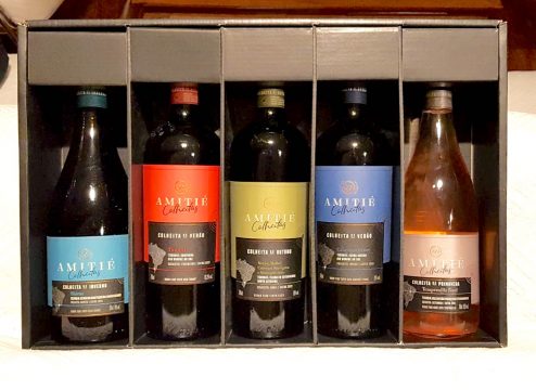 Os opções de vinhos foram da coleção Amitié Colheitas: - Colheita de Primavera ( Rosé de Tempranillo do Vale do São Francisco) - Colheita de Outono ( Blend da Serra Catarinense tinto) - Colheita de Inverno( Shiraz da Serra da Mantiqueira) - Colheita de Verão (Tannat da Campanha Gaúcha) - Colheita de Verão (Cabernet Franc da Serra Gaúcha)