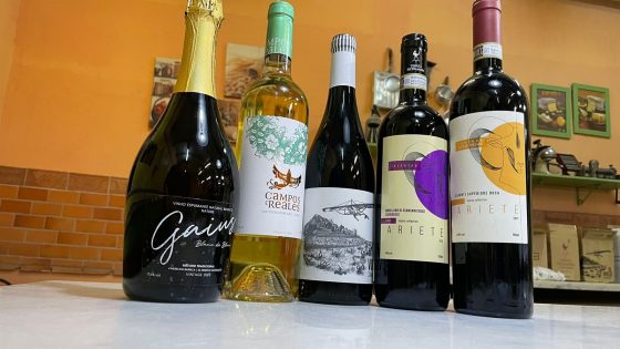 Os vinhos foram: - Espumante Gaius Blanc de Blanc Vintage Nature 24 Meses - Brasil - Campos Reales Branco 2021 - Espanha - El Vuelo Roble 2016 - Espanha - Ariete Chianti Superiore Governo DOCG 2017 - Itália - Ariete Incontro Morellino Di Scansano DOCG 2019 - Itália